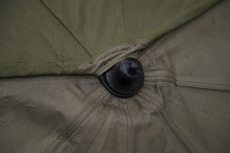 The mesh attaches to the brolly via an elastic loop around the bell cap and is then pegged down at the end of each side rib. It can also be pegged down at the front or simply left to drape – the usual method on still, humid summer nights.